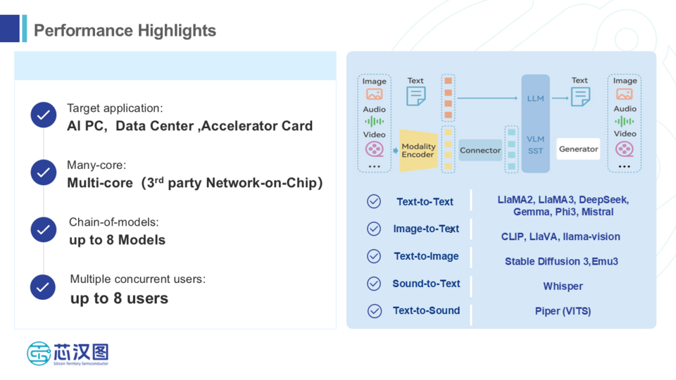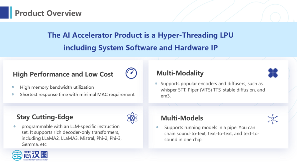 公司联合打造的高性能AI推理卡也在展会同期展出。该产品采用Hyper-Threading技术,并率先集成高带宽DRAM,可高效支持多种开源大模型的部署与应用,广泛适用于AI PC、AI台式机及数据中心加速卡等多元终端产品。此外,基于PCIe Switch与多颗端侧LPU互联技术构建的一体机解决方案,实现了卓越的扩展性,最高可支持64张推理芯片的灵活组合,充分满足边缘计算的高性能。